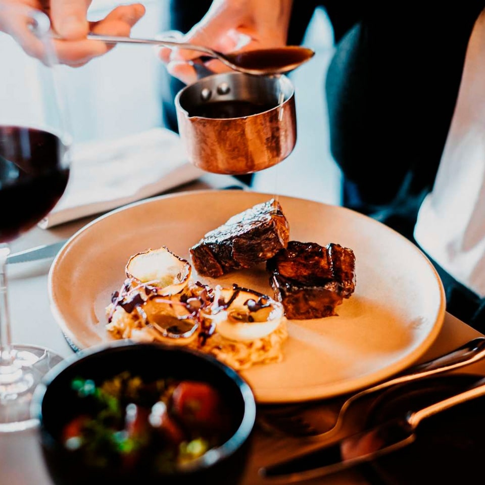Húsagarður er matstova har óhátíðarligur vertskapur og góður matur skapa hugnaligar matupplivingar. Á Húsagarði bjóða vit eina 3- ella 5 rætta matskrá ella stakar rættir. Í køkinum verður matur við íblástri úr norðurlendskari matgerð tilgjørdur og borðreiddur av tænaratoyminum. Til hvønn rætt hava vit valt vín úr okkara fjølbroytta vínkjallara, Gilið, sum hevur vín úr øllum heiminum og í øllum prísflokkum. Vit hava eisini ment eina serliga alkoholfría drekkiskrá, ið millum annað inniheldur fleiri sløg av kaltbryggjaðum te og cider.