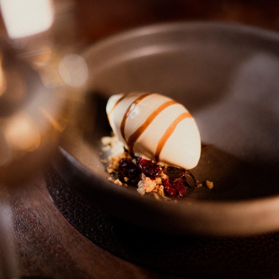 • Sjokoláta panacotta, blóðappilsin og “grús”